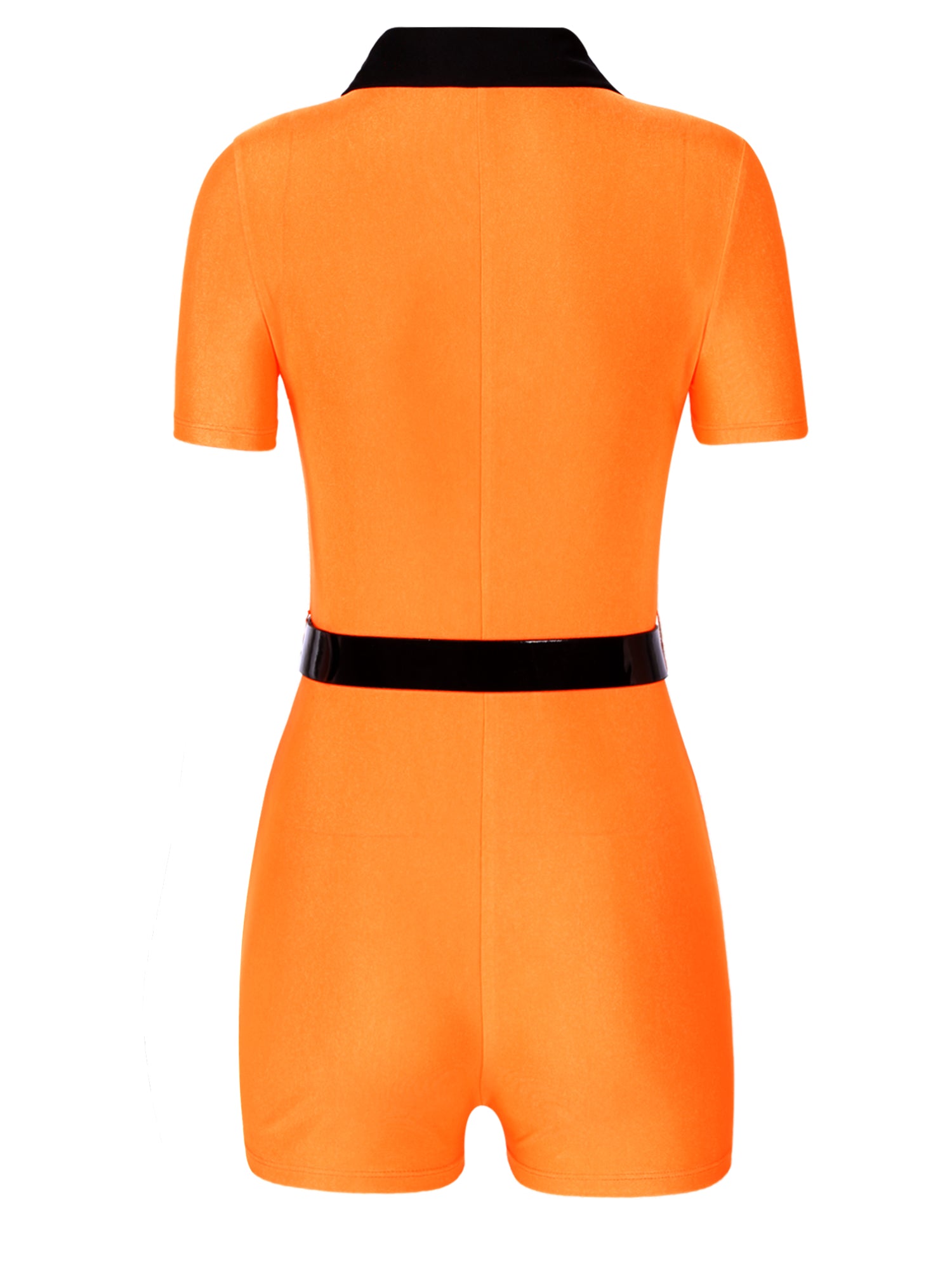 The short sleeve jumpsuit features a modern, flattering turn-down collar and a convenient front zipper closure, letting you control how much you reveal. Paired with a stylish faux leather belt, this outfit hugs your figure in all the right places, creating a seductive yet playful prisoner vibe.